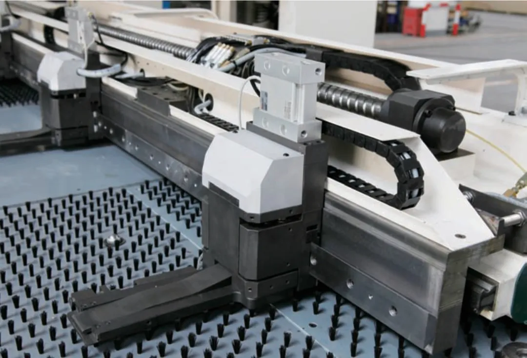 Hệ thống cấp phôi dùng vít me – ray trượt THK, bánh răng – thanh răng mài chính xác, hộp giảm tốc STUBER (Đức), động cơ servo FANUC; tốc độ X đạt 100 m/phút, Y đạt 80 m/phút.